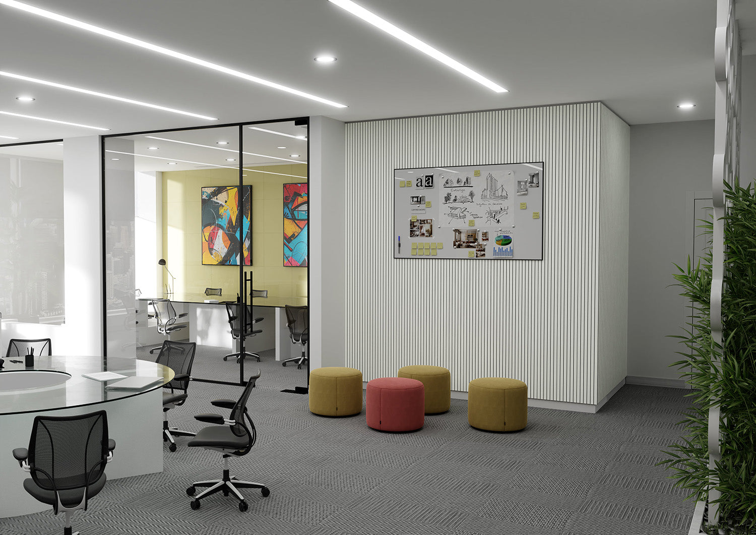 Gute Akustik im Büro fördert Konzentration, reduziert Stress und steigert die Produktivität. Mit den slimline-Akustikpaneelen lassen sich Nachhall und störende Geräusche effektiv minimieren.
